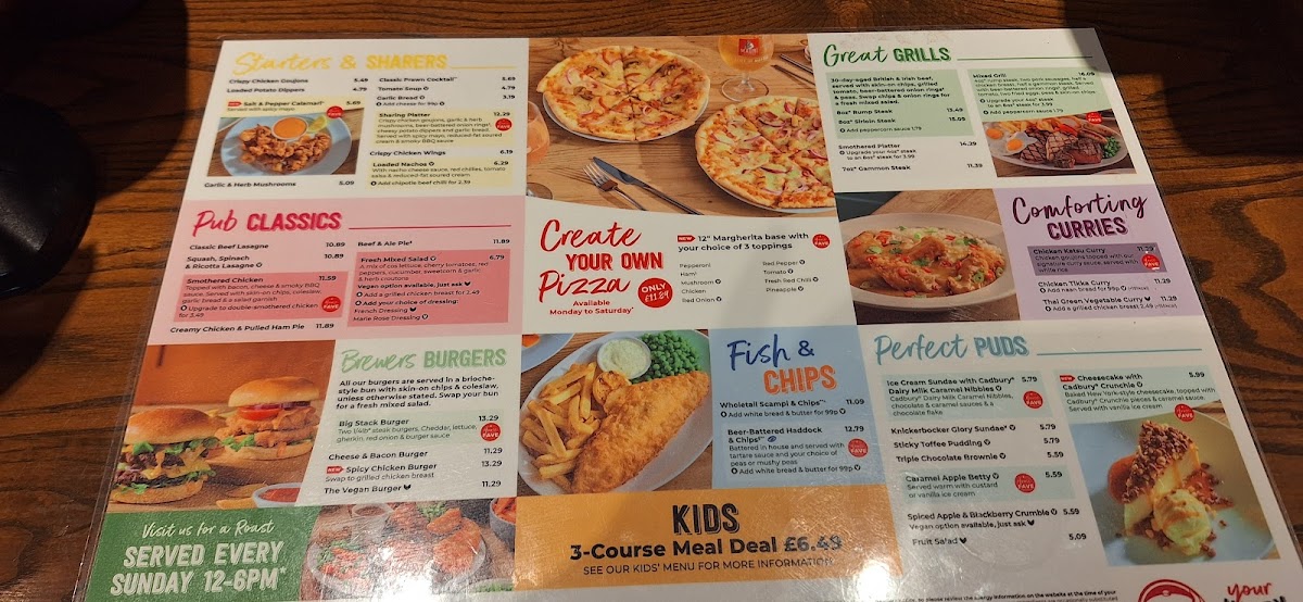 For families, the adjacent Premier Inn makes it a go-to spot for guests seeking convenient dining, and the indoor play area helps keep children entertained while adults unwind. The kids’ menu is well-structured, offering balanced meals that go beyond the typical fast-food fare, with clear allergen information and portion sizes suitable for a range of ages.
